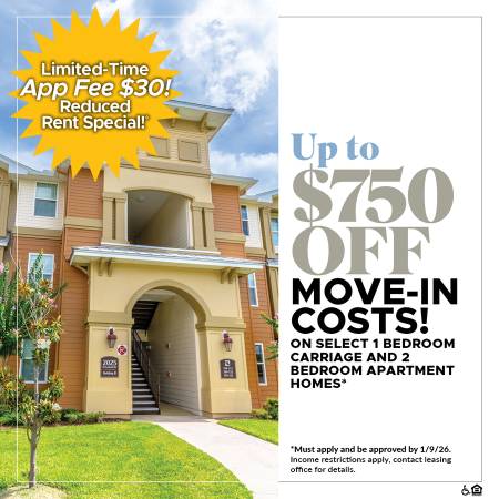 Up to $750 Off Move-In Costs on Select 1 Bedroom Carriage and 2 Bedroom Apartment Homes. App Fee only $30!*