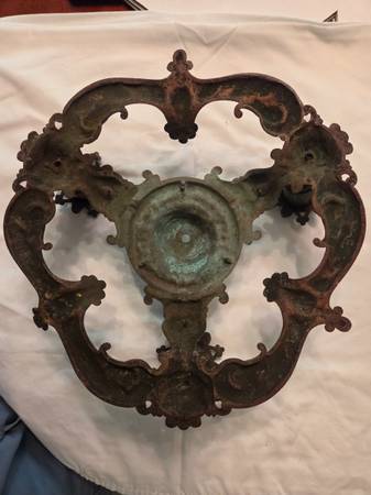 Rare 100 year old bronze chandelier made by Kayline. Heavy patina with 3 light sockets. Will need wiring and or restoration