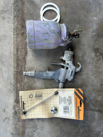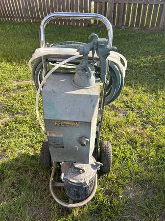 Wagner Capspray CS9000 HVLP Paint Sprayer, complete setup including cart, turbine, compressor, pressure pot, and two spray guns. This unit had very little usage over the years. This is an older machine that spent most of its life in storage. It has a new pressure regulator on the pressure pot, a new paint hose, and new filter on the turbine unit. This unit is in working condition and comes with an owner manual, and a few spare parts. Reasonable offers will be considered.