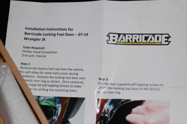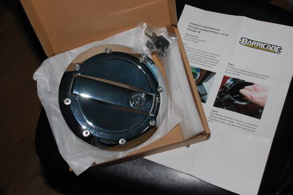 New in box. Chrome Metal Locking gas cover. Instructions shows it fits Wrangler 07-14 but might fit others too. Jeep locking gas cover. Paperwork and keys included. $49 CASH picked up in Grant...