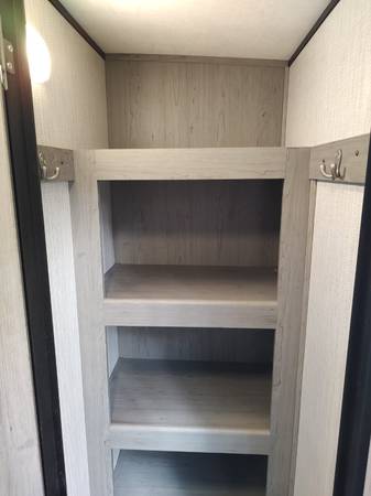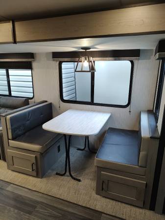 The interior has a simple single slideout, nice size bathroom and a single bedroom up front. The sofa and the booth both convert to beds, so it can sleep up to 6. There is a fireplace and stereo with both inside and outside speakers. Theres a big hall closet, lots of storage in the bathroom and a bunch of storage in the bedroom. The AC works great. Propane heating system. Propane hot water heater. It has a YETI Insulation package to help with AC and heating. All the lighting is LED inside and out.